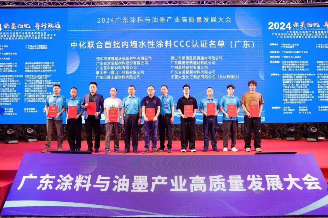 7 月 30 日,广东涂料与油墨产业高质量发展大会于广东江门盛大举行。作为国内率先通过 CCC 认证的涂料企业之一,广州昊特建材有限公司获邀见证此次大会的盛景,并参与了行业首批内墙水性涂料 CCC 认证证书的颁发典礼。在此之前,昊特建材已相继通过法国 A+认证标准、ISO9001认证、ISO14001认证、中国环境标志产品认证等等。而此次广州昊特建材有限公司成为行业首批通过 CCC 认证的企业,这进一步证实并有力肯定了企业在产品安全和可靠性方面的表现。 在这次审核过程中,北京中化联合认证中心的专家团队针对昊特的生产线、产品性能以及环保指标展开了全方位且细致入微的评估。他们对每一个生产环节都进行了深入探究,从原材料的选取到成品的出厂,无一遗漏。
