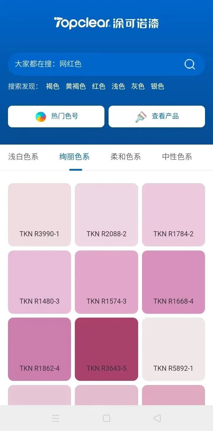 进入电子色卡界面,选择主题色系,点击色卡进入详情页,轻松获取色卡编号、名称及RGB数值。
