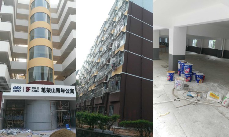 这次深圳笔架山青年公寓的涂装所使用涂料分别是涂可诺的通用外墙漆,以及今年推出同时也是最近主打的“加量不加价”的“焕丽墙面漆”,通用外墙漆作为外墙的主要使用涂料,也是涂可诺外墙中深受广大客户喜欢的一款外墙漆;而今年推出的焕丽系列,也是涂可诺经过市场调查符合消费者需求,无论在环保还是质量方面都是非常优质的一款水性涂料,而且目前推行的加量不加价的包装性价比非常之高,施工师傅都推荐作为主要使用产品。