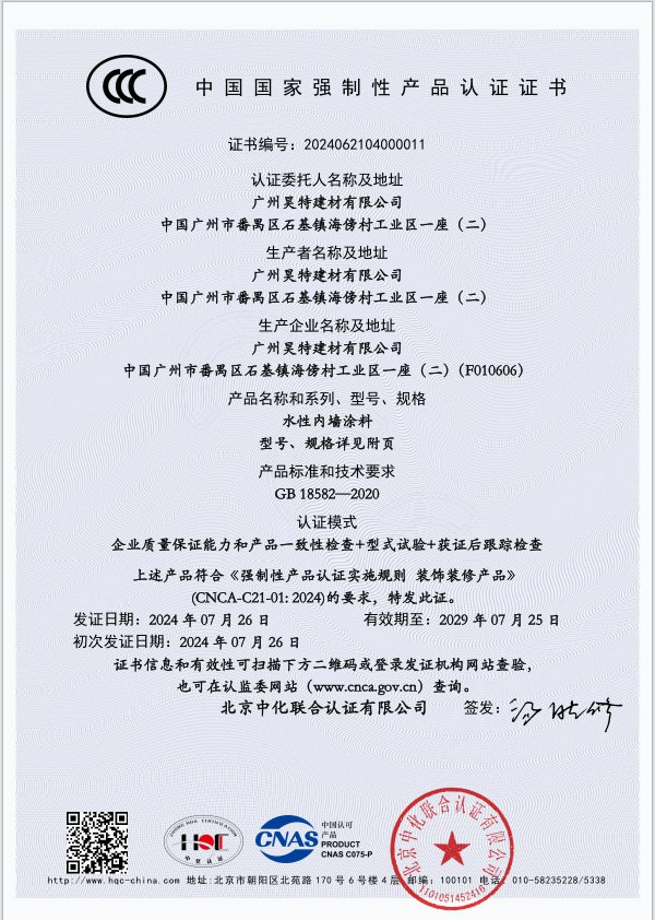 7 月 30 日,广东涂料与油墨产业高质量发展大会于广东江门盛大举行。作为国内率先通过 CCC 认证的涂料企业之一,广州昊特建材有限公司获邀见证此次大会的盛景,并参与了行业首批内墙水性涂料 CCC 认证证书的颁发典礼。在此之前,昊特建材已相继通过法国 A+认证标准、ISO9001认证、ISO14001认证、中国环境标志产品认证等等。而此次广州昊特建材有限公司成为行业首批通过 CCC 认证的企业,这进一步证实并有力肯定了企业在产品安全和可靠性方面的表现。 在这次审核过程中,北京中化联合认证中心的专家团队针对昊特的生产线、产品性能以及环保指标展开了全方位且细致入微的评估。他们对每一个生产环节都进行了深入探究,从原材料的选取到成品的出厂,无一遗漏。