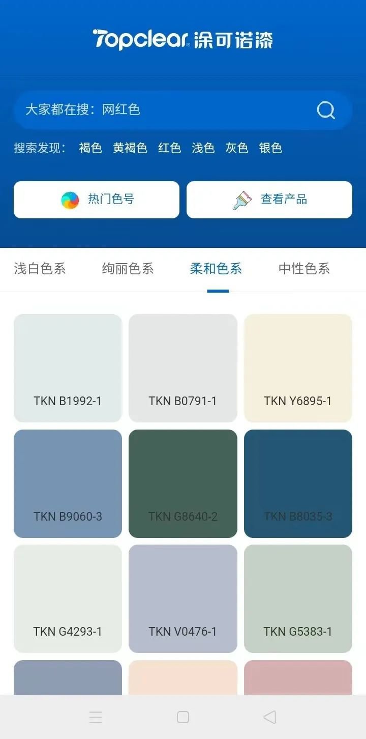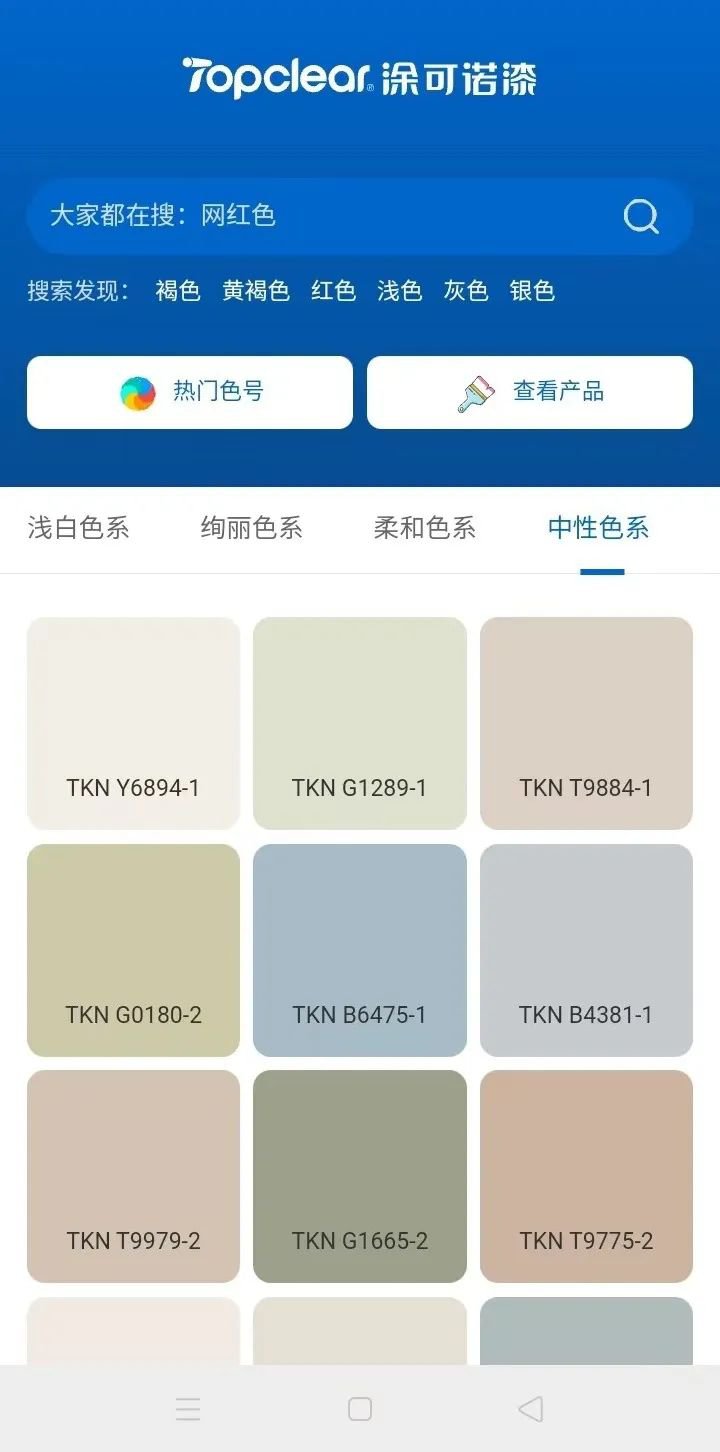 进入电子色卡界面,选择主题色系,点击色卡进入详情页,轻松获取色卡编号、名称及RGB数值。